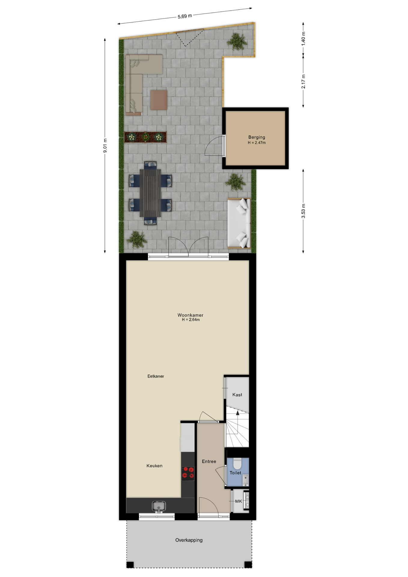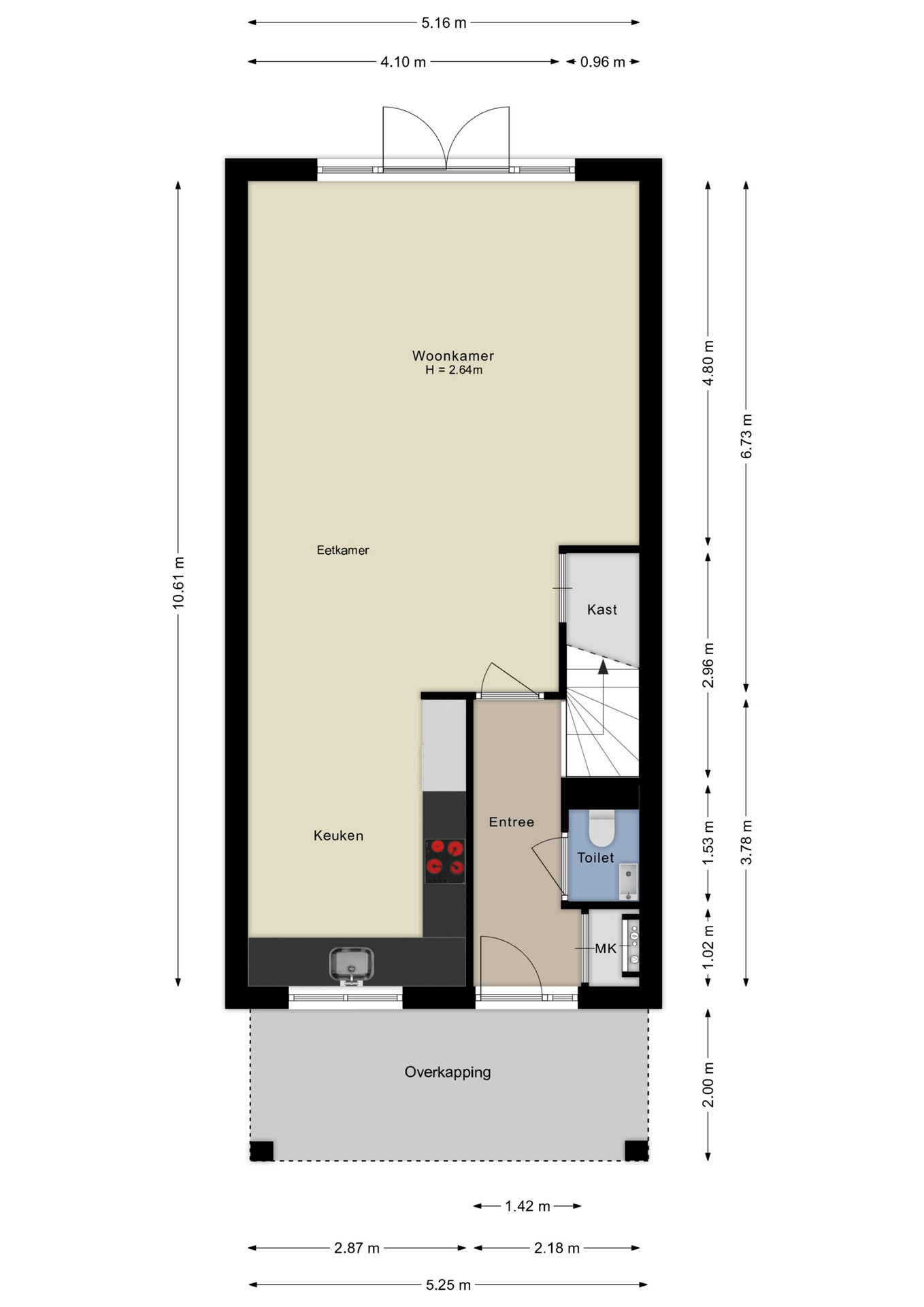 Stap binnen in de hal die je welkom heet met praktische zaken zoals meterkast, toilet met fontein, en trapopgang naar boven. De woonkamer, fris en uitnodigend, is voorzien van een PVC vloer met aangename vloerverwarming en directe toegang tot de trapkast en de heldere achtertuin. De keuken is eveneens modern en uitgerust met inbouwapparatuur en voldoende werkruimte om comfortabel maaltijden te bereiden.