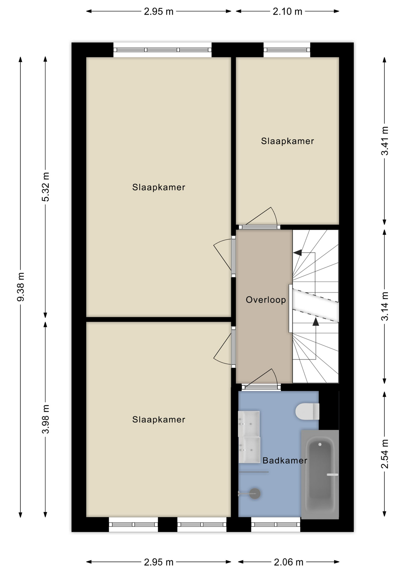 Op deze verdieping vind je drie royale slaapkamers en de badkamer. De kamers zijn stuk voor stuk licht en ruim, waardoor ze ideaal zijn als slaapkamer of kantoor. De badkamer is netjes afgewerkt en voorzien van een douche, ligbad, dubbele wastafel en tweede toilet.