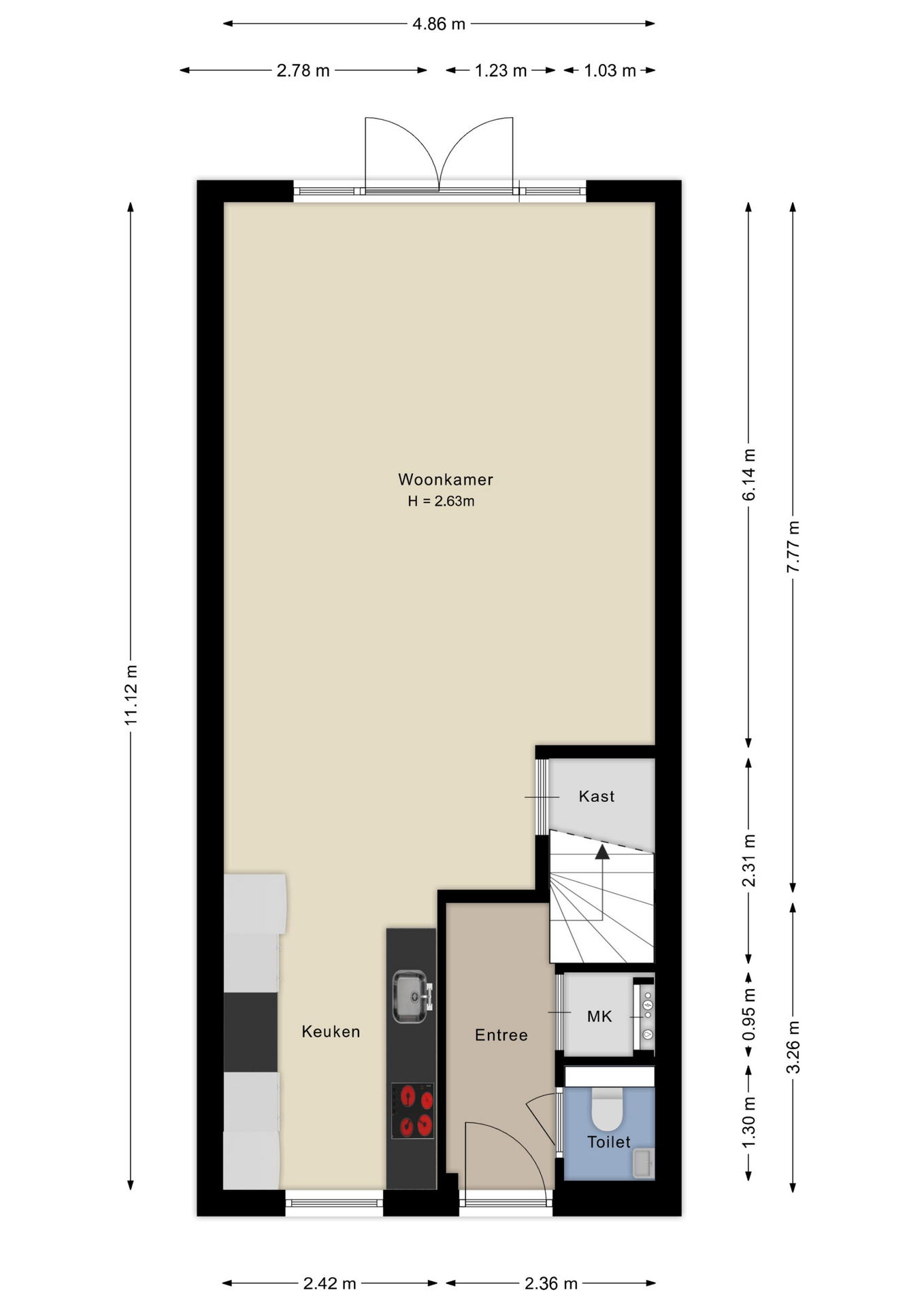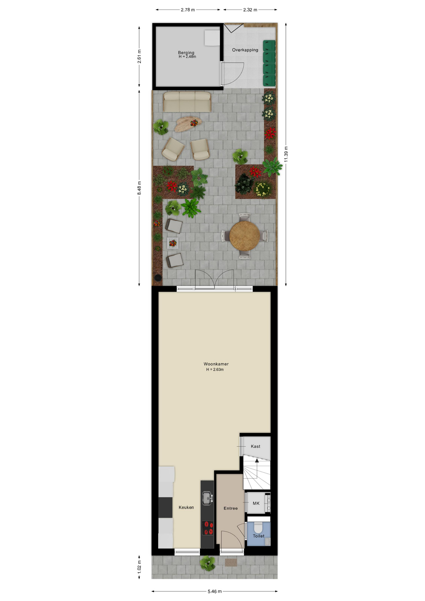 Binnenkomen doe je in de ruime hal met meterkast en toiletruimte. Aan de voorzijde vind je de lichte, open keuken met volop werkruimte en moderne inbouwapparatuur. De uitgebouwde woonkamer aan de achterzijde is een heerlijke leefruimte, voorzien van trapkast en openslaande deuren naar de zonnige tuin met berging en achterom.
