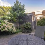 Net aangelegde voortuin met sierbestrating en enkele groenbegroeiing, alle ruimte om een gezellig bankje te plaatsen; op het westen gelegen achtertuin met achterom, fraai aangelegd met een groot betegeld terras en rondom plantenborders met veel groen, berging achterin de tuin.
