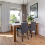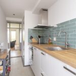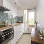 De keuken staat in open verbinding met de hal. Deze is voorzien van plafondspots, een inbouwkast en glazen balkondeur. Je hebt de beschikking over een moderne, lange rechte keuken, voorzien van een houten werkblad, sfeervolle wandtegels, een vaatwasser, combi-oven, brede kookplaat en RVS afzuigkap. Tegenover de keuken kun je eventueel een bartafel of keukenkast plaatsen.