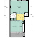 De voordeur geeft toegang tot de ruime hal, die in verbinding staat met alle ruimtes van het appartement: de keuken, de woonkamer, de meterkast, de slaapkamer, de badkamer en het moderne toilet.