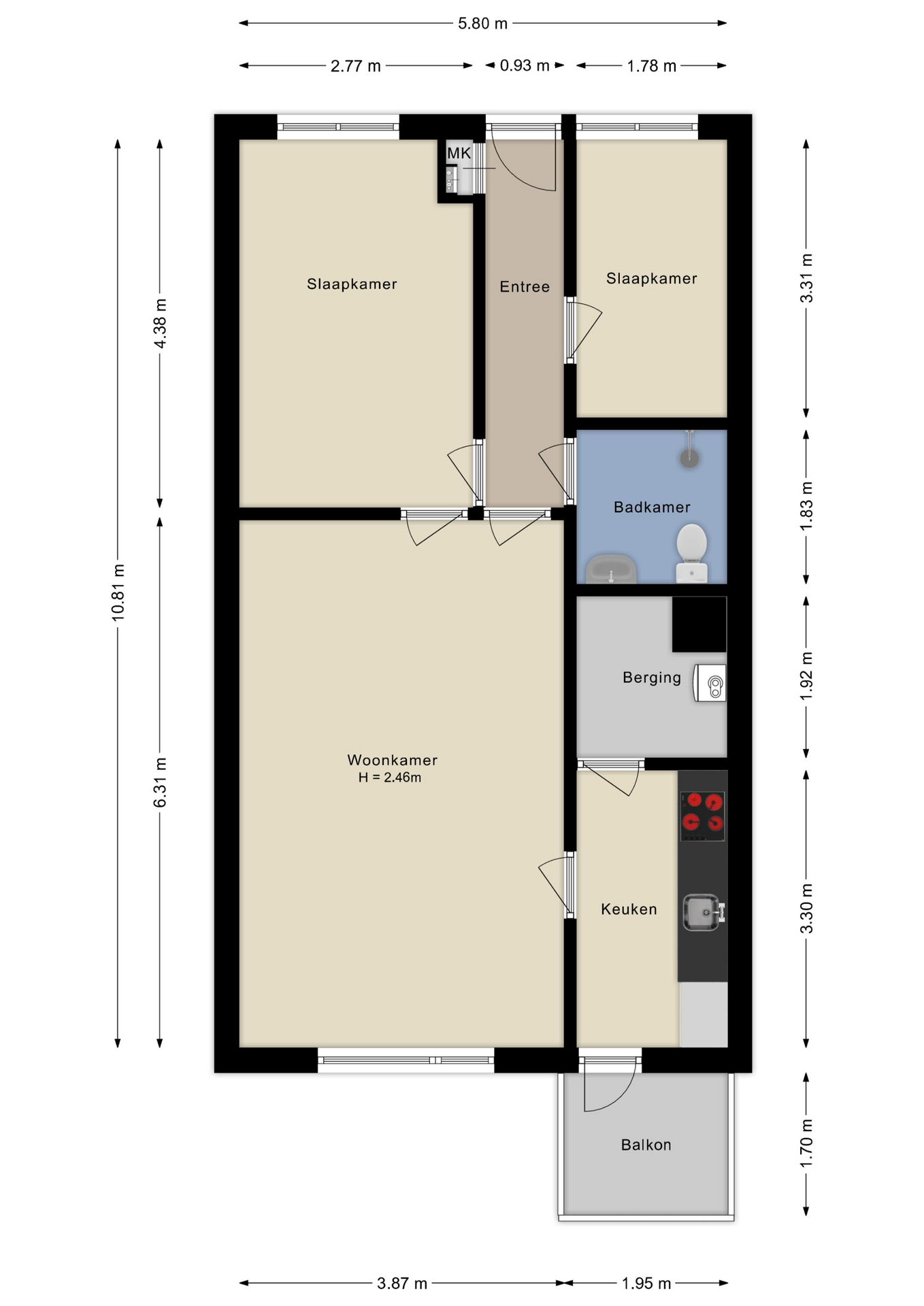 De twee slaapkamers zijn beide van goed formaat. De grootste slaapkamer biedt voldoende ruimte voor een tweepersoonsbed en kledingkast, terwijl de tweede slaapkamer ideaal is als logeerkamer of werkkamer. De badkamer is eenvoudig maar praktisch ingericht met een douche, wastafel en toilet.