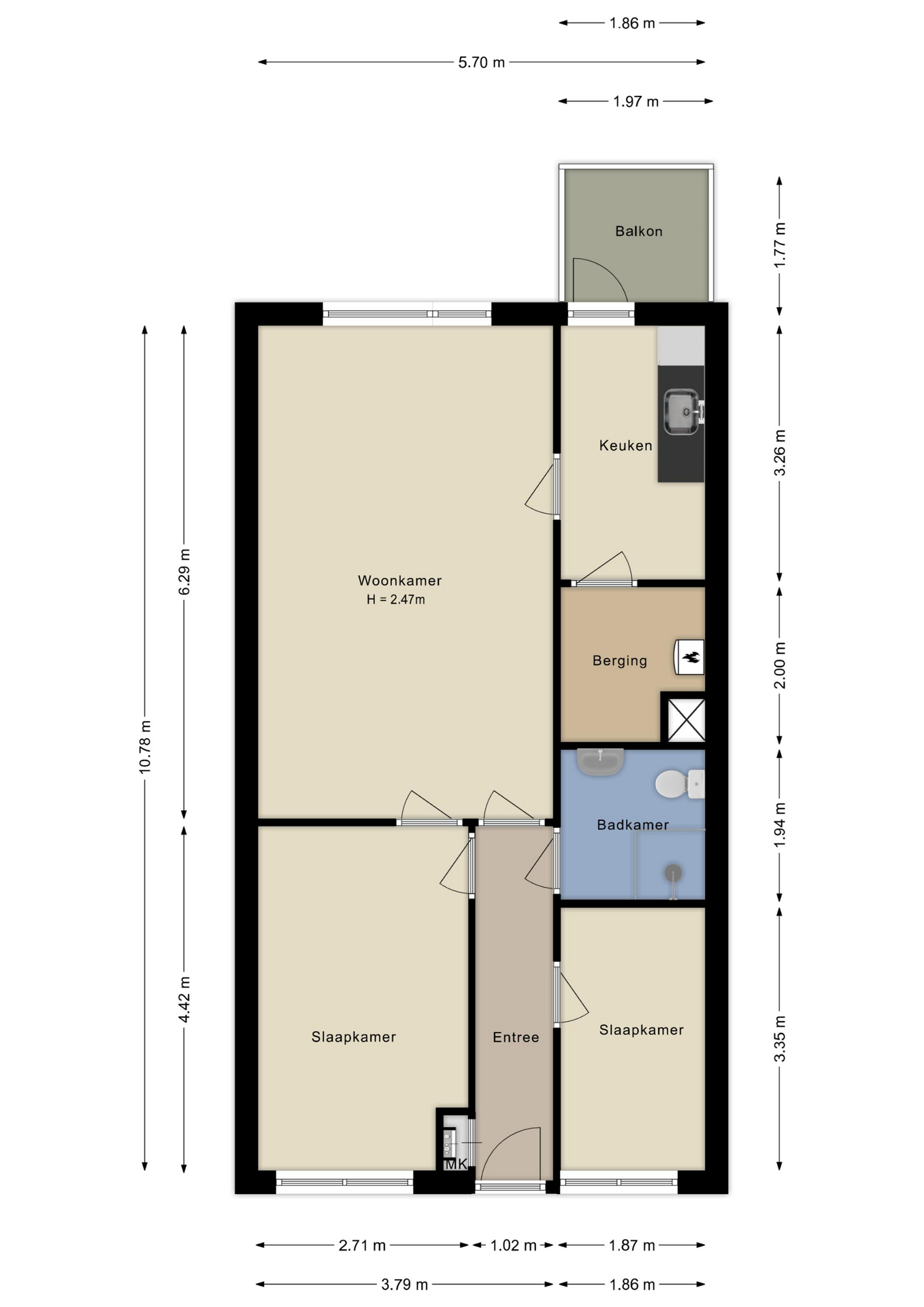 - Twee slaapkamers;