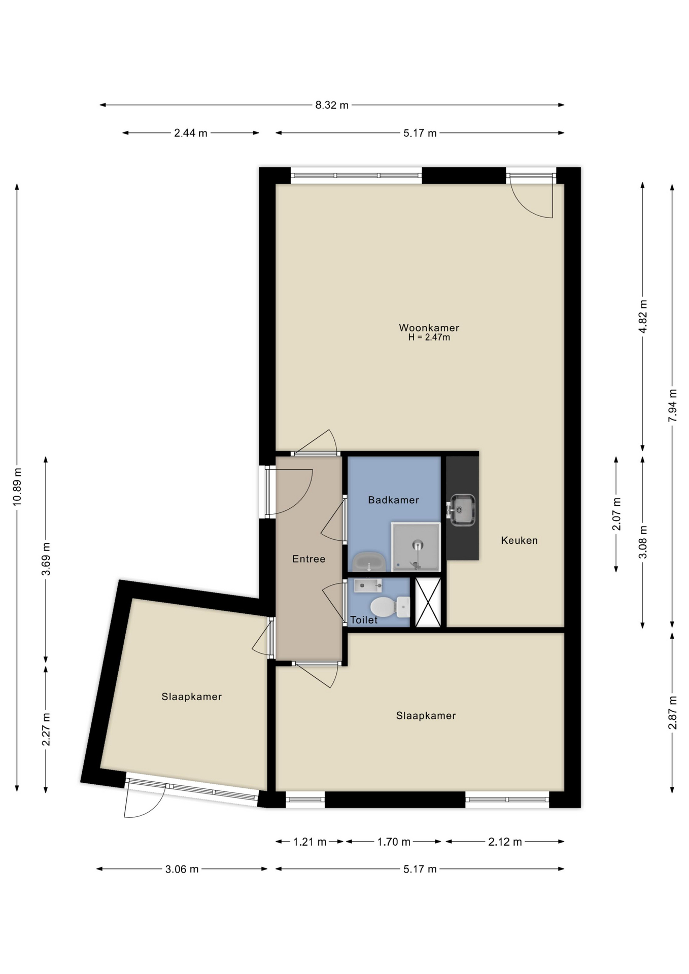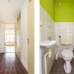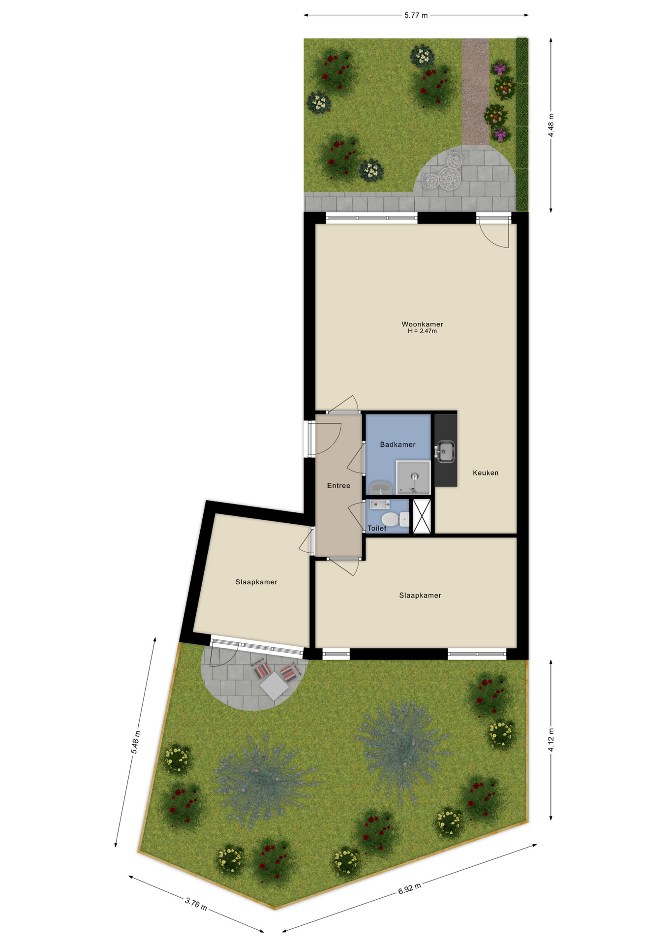 Het appartement beschikt over twee slaapkamers. De hoofdslaapkamer is ruim van formaat. De tweede slaapkamer is compacter, maar heeft als groot voordeel directe toegang tot de achtertuin. Deze ruimte is daardoor uitstekend geschikt als slaapkamer, werkkamer of hobbyruimte. De badkamer is volledig betegeld en voorzien van een douche, wastafel en aansluiting voor de wasmachine (met trekschakelaar). Daarnaast is er een separate toiletruimte met fonteintje. In de centrale hal bevinden zich tevens de meterkast en de stookruimte, waar de cv-installatie is geplaatst. In deze ruimte is bovendien extra bergruimte aanwezig.