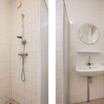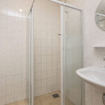 De badkamer is voorzien van een douchecabine, wastafel en aansluiting voor de wasmachine. Separate toilet met fontein.