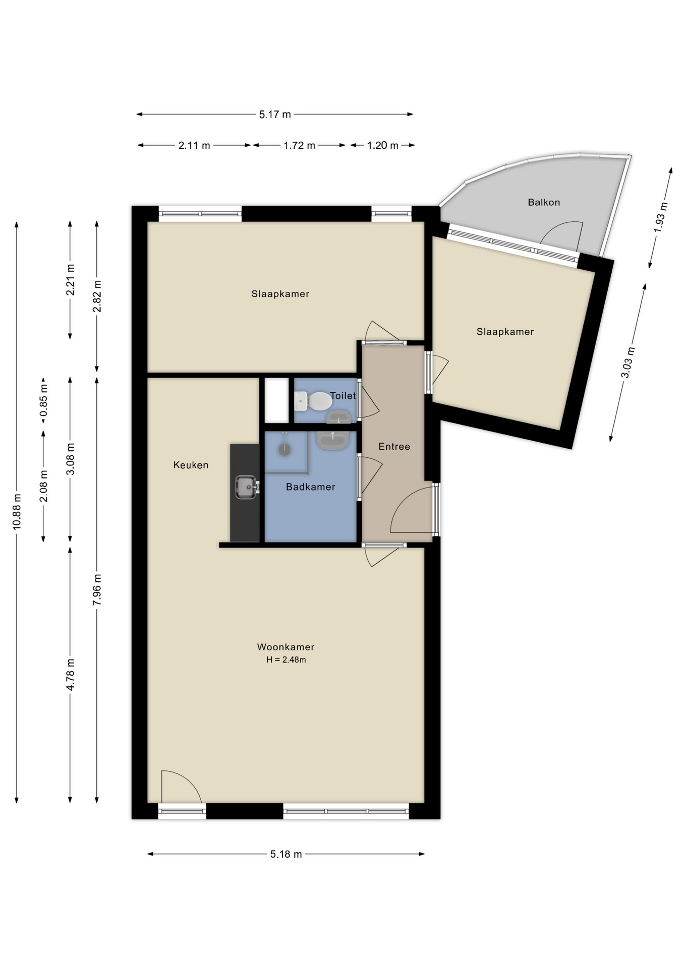 Entree/hal met toegang tot alle vertrekken. De woonkamer is licht en gezellig en heeft een Frans balkon. Aansluitend bevindt zich de eenvoudige keuken, die ruimte biedt om geheel naar eigen wens te moderniseren.