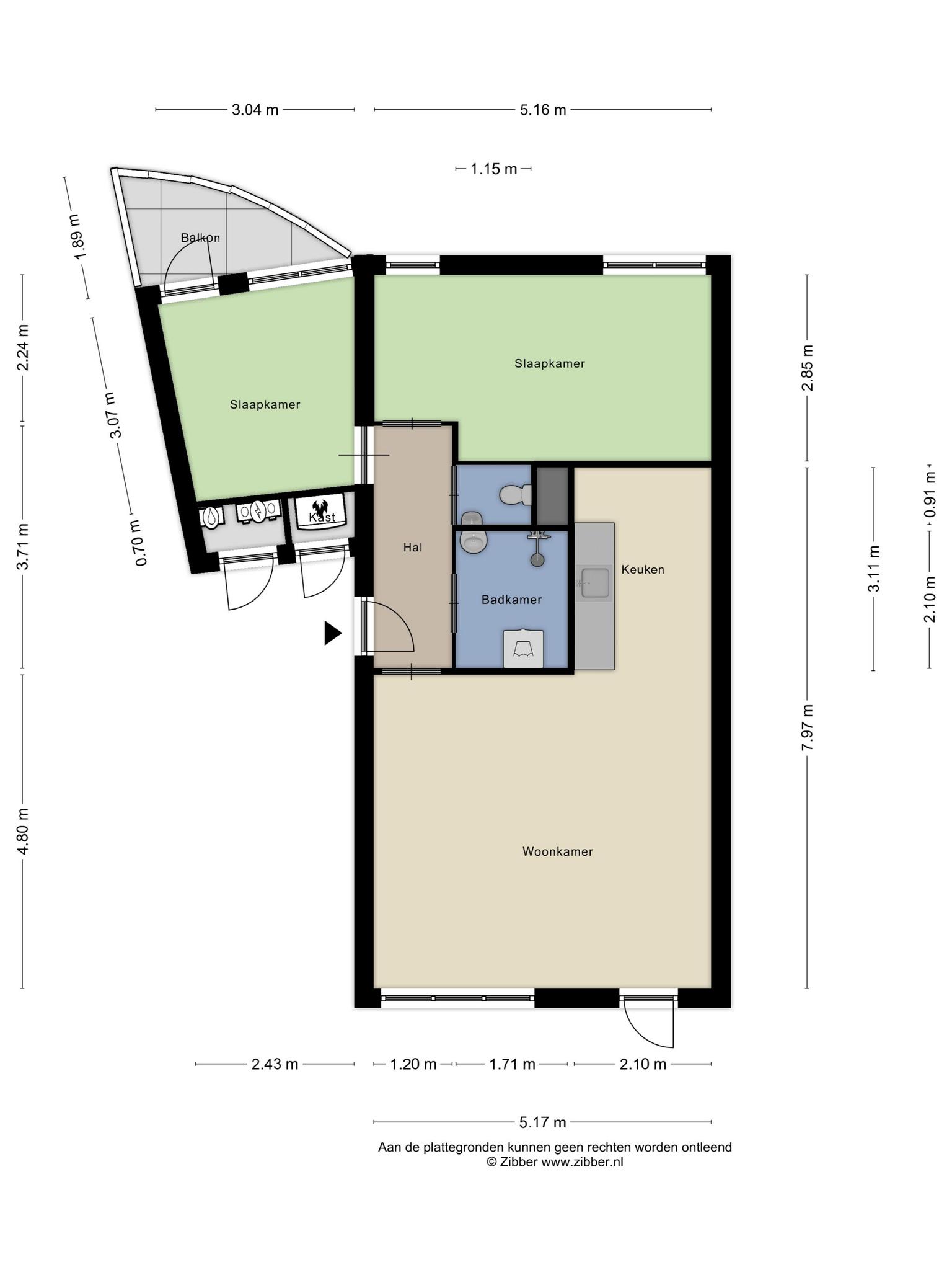 Entree, hal met toilet met fontein. Lichte woonkamer met Frans balkon. Halfopen keuken met eenvoudig keukenblok. Twee prima slaapkamers, waarvan één met met toegang naar het balkon. Moderne badkamer met douche, wastafel en handdoekenradiator.