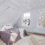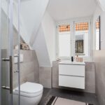 Overloop, moderne badkamer met douche en wastafelmeubel. Ruime, lichte slaapkamer met 2 originele raampartijen met roedeverdeling.