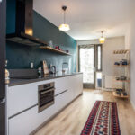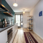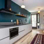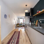 De moderne open keuken is aan de voorzijde van de woning gelegen en is voorzien van inbouwapparatuur zoals een inductiekookplaat, afzuigkap, combi-oven, losse koel-vriescombinatie en een vaatwasser. Via de deur in de keuken is ook de loggia bereikbaar.