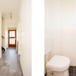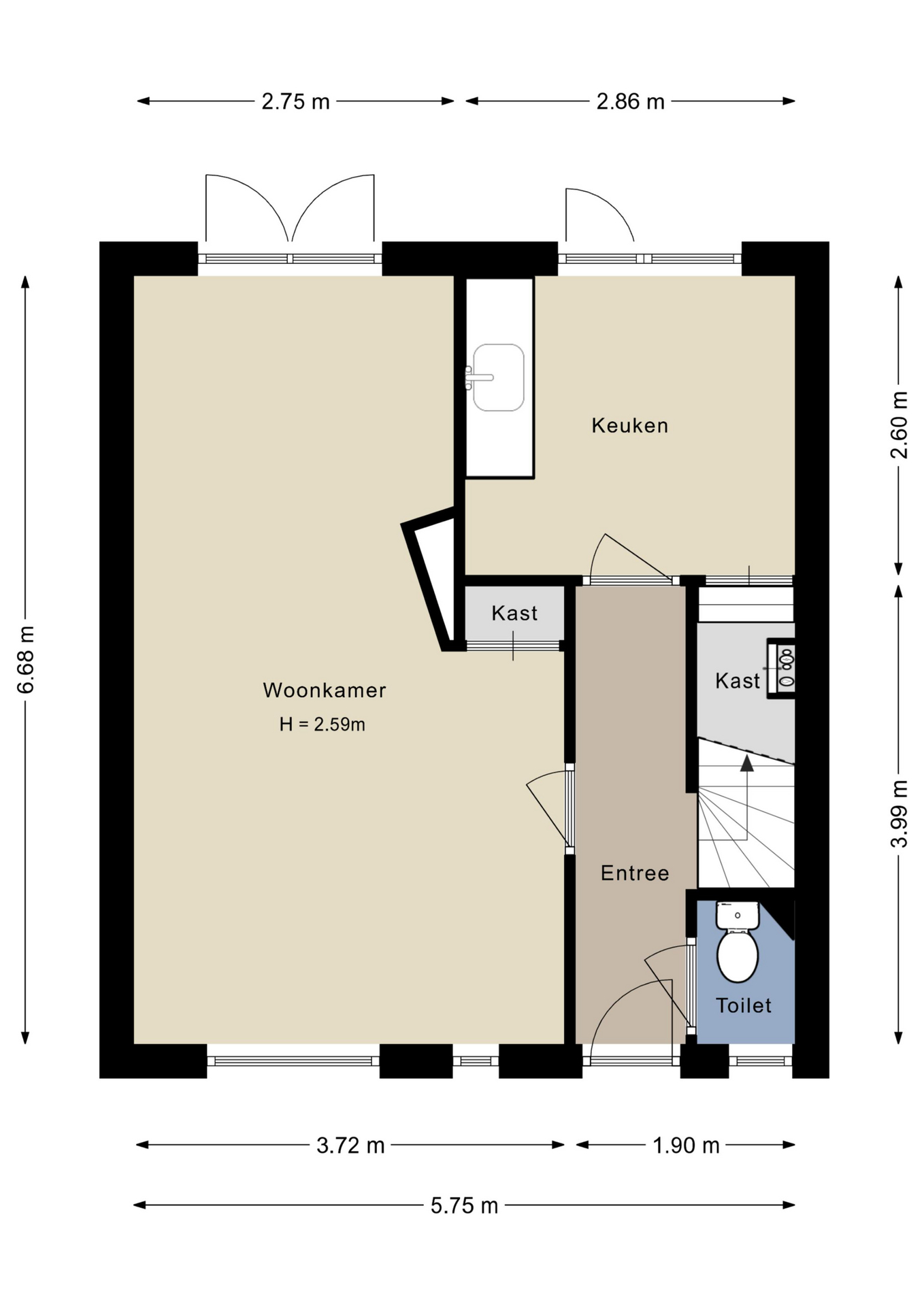 Begane grond: Entree, hal met toiletruimte en trapopgang. De ruime doorzonwoonkamer heeft openslaande deuren naar de achtertuin en een praktische vaste kast. De gesloten keuken is voorzien van een net, grijs keukenblok en biedt toegang tot zowel de achtertuin als de kelder-/meterkast. Ook bevindt zich hier de aansluiting voor de wasmachine.
