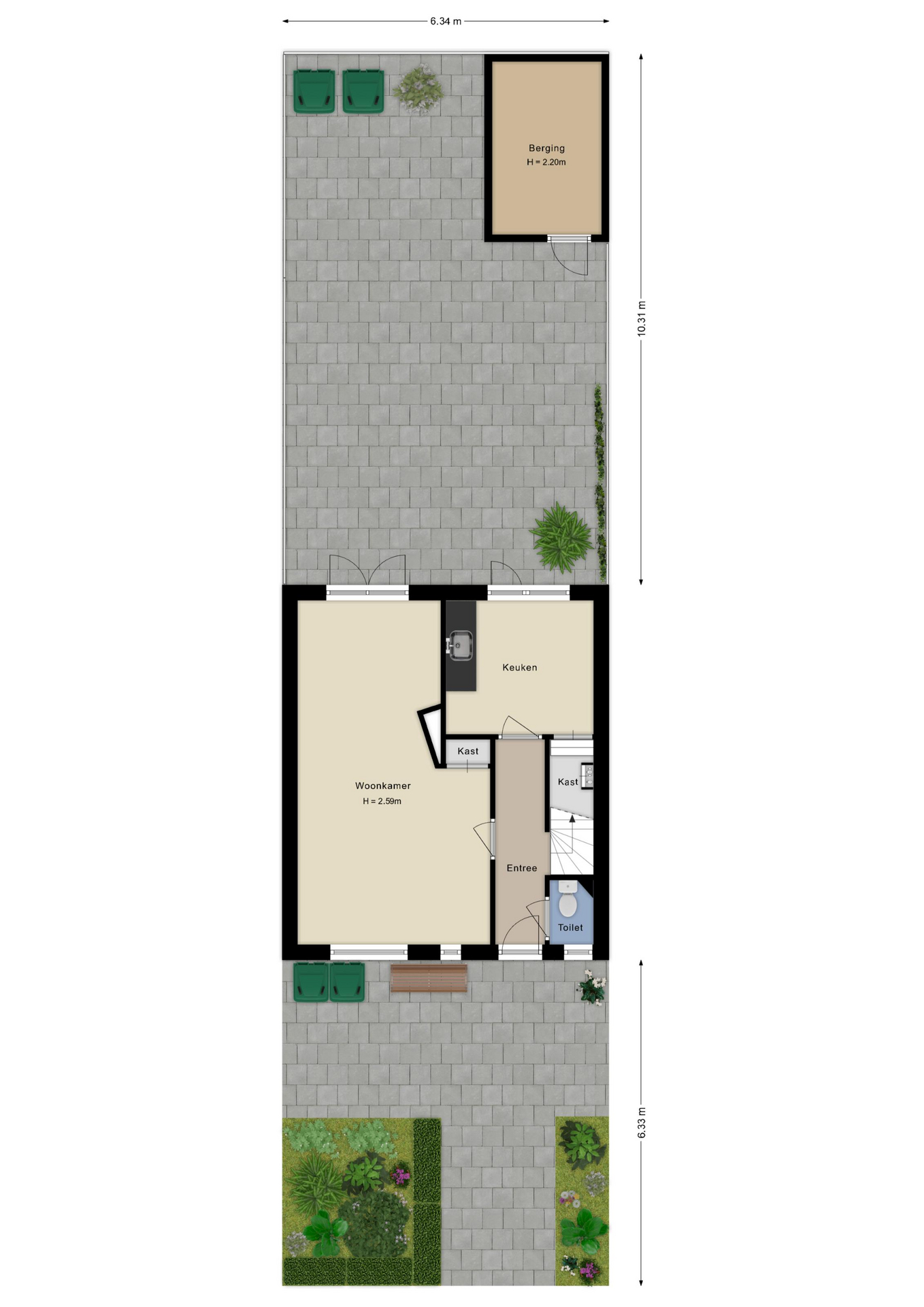 Buitenruimte: De zonnige achtertuin, gelegen op het zuidwesten, is volledig betegeld en bereikbaar via een achterom. Hier vind je een vrijstaande stenen berging en een buitenkraan aan de gevel. Ook de voortuin is verzorgd aangelegd, met een fijn terras en beplanting.