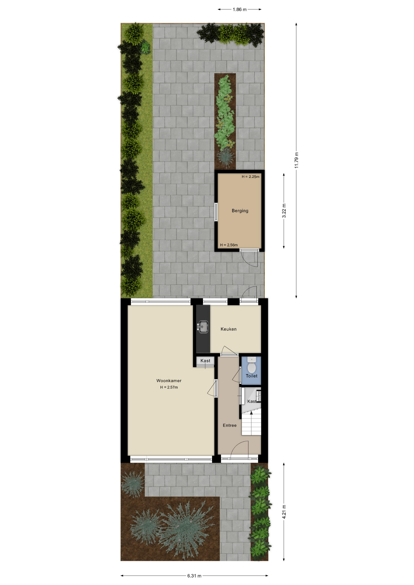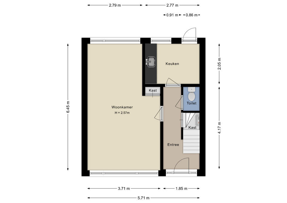 Je komt binnen via de hal met meterkast, trapopgang en toilet. De doorzon woonkamer is licht en ruim, voorzien van laminaatvloer en een vaste kast. De gesloten keuken is gedateerd maar functioneel en voorzien van aansluiting voor een wasmachine. Vanuit de keuken heb je toegang tot de achtertuin. Hier tref je ook een vrijstaande stenen berging én een achterom.
