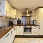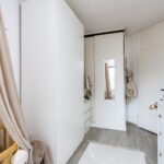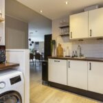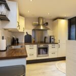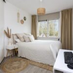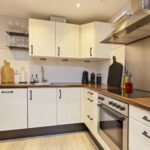 De hal/entree met meterkast en veel ruimte voor de garderobe, biedt toegang tot de ruime woonkamer met open inbouwkeuken. De woonkamer is maar liefst 27 m2 groot, modern ingericht, voorzien van een strakke vloer-/wandafwerking en is speels qua indeling door enkele schuine muren en de erker. Door de grote raampartijen beschikt het appartement over veel lichtinval en vrij uitzicht over de woonwijk. Aansluitend bevindt zich de nette open keuken met koel-/vriescombinatie, oven, kookplaat, afzuigkap en vaatwasser.