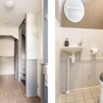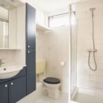 De badkamer is voorzien van een douchecabine, wastafelmeubel en tweede toilet.