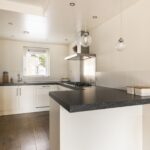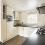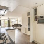 Open keuken in hoekopstelling met eetbar, 5-pits gaskookplaat, RVS-afzuigkap, RVS-spoelbak, vaatwasser (2021 vernieuwd), apothekerskast, koelkast, vriezer en voldoende kastruimte.