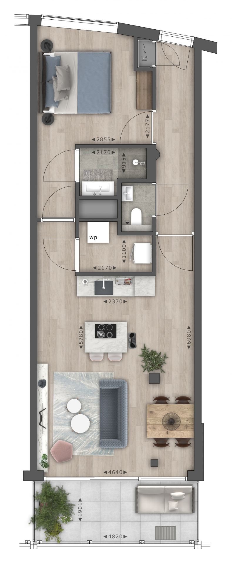 - Alle appartementen zijn volledig gestoffeerd, dus inclusief PVC-vloer, wandafwerking en gordijnen