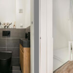 De overloop geeft toegang tot de toiletruimte, trapopgang naar de tweede verdieping, de woonkamer en werkkamer. De toiletruimte, welke in 2022 is vernieuwd, heeft een matzwart hangend toilet en een toiletkastje met natuurstenen fontein.
