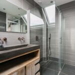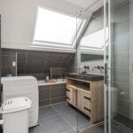 De badkamer is in 2019 gerenoveerd en voorzien van een ligbad, dubbel wastafelmeubel met natuurstenen wastafel en geïntegreerde kranen en royale inloopdouche. Prettig is het dakraam welke zorgt voor natuurlijke ventilatie en daglicht. Door kleur en materiaalkeuze een heerlijke plek om te relaxen. Verder is ook de wasmachine aansluiting hier gesitueerd.