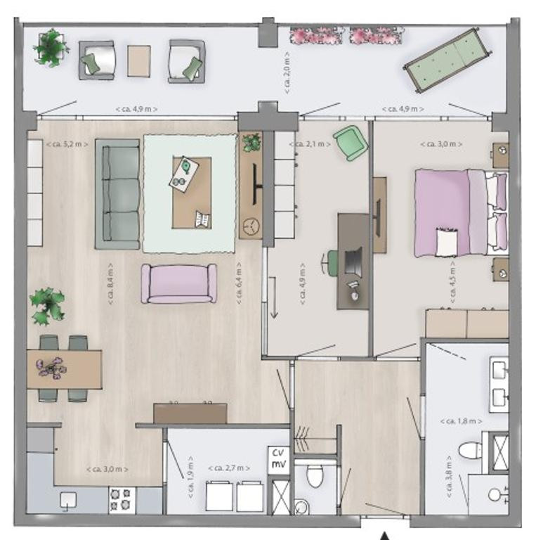 - Zonnig en royaal balkon over de gehele breedte op het zuiden.