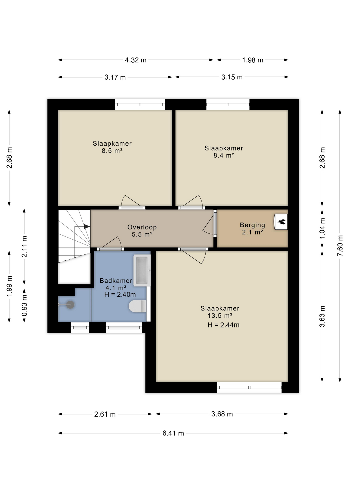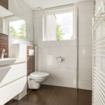Overloop met lichtkoepel die zorgt voor extra daglicht. Er is een volledig betegeld toilet met fonteintje. De ruime badkamer is eveneens volledig betegeld en voorzien van een inloopdouche met regendouche en thermostaatkraan, een dubbele wastafelmeubel, een tweede toilet en een handdoekenradiator. Verder zijn er drie grote slaapkamers.