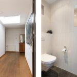 Entree, royale hal voorzien van houten vloerdelen, modern afgewerkte toiletruimte met hangend closet en fonteintje, toegang tot de bijkeuken voorzien van wasmachine-/ en drogeraansluiting, toegang tot de kelder en meterkast.