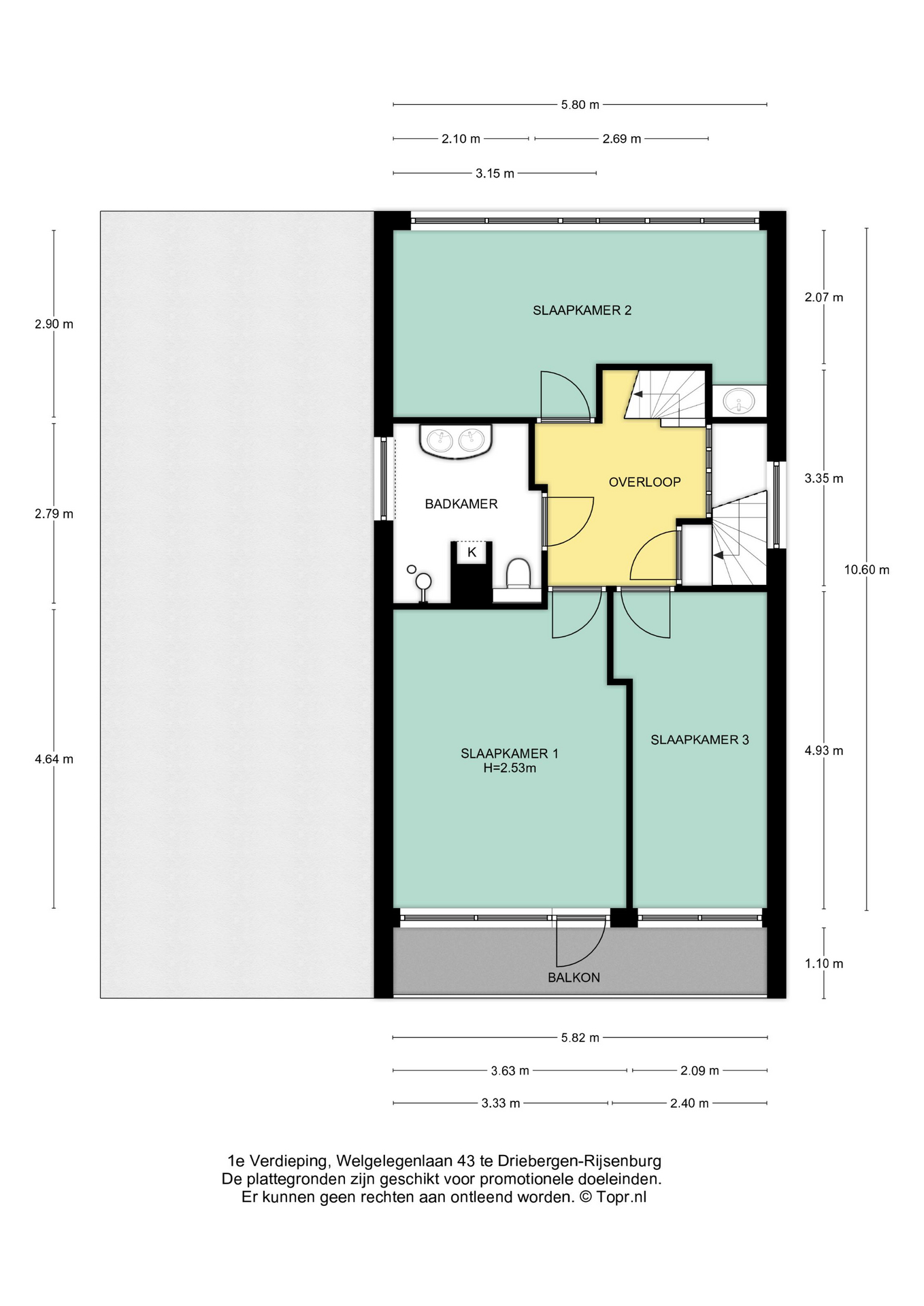 Op de eerste verdieping zijn drie slaapkamers aanwezig. Aan de voorzijde is via de ruime slaapkamer het balkon toegankelijk. Het balkon is ca. 6,5m2 groot en ligt op het zuidoosten.