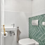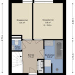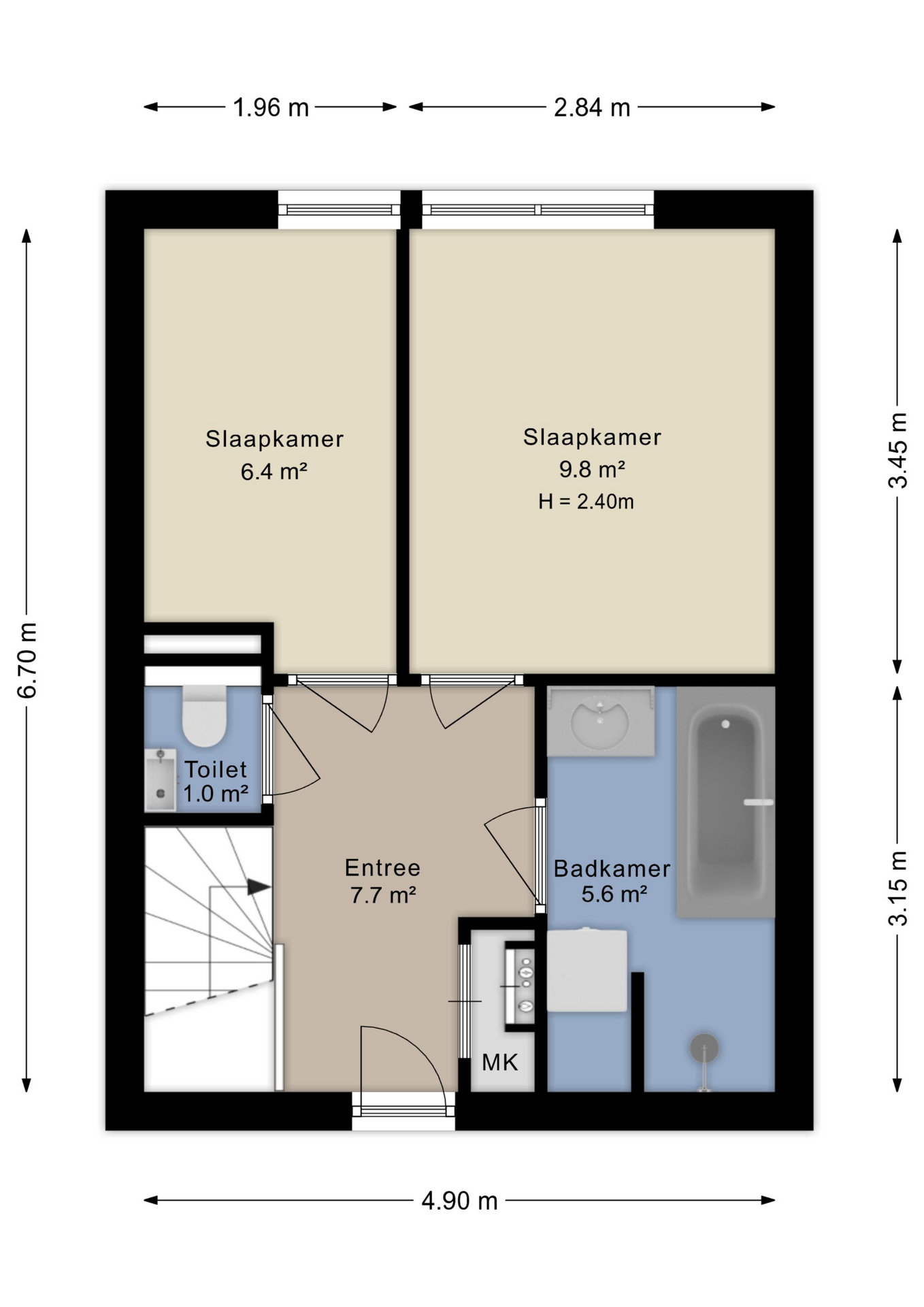 Via de entree op de eerste verdieping kom je in de hal met toegang tot de slaapkamers, de badkamer, het separate toilet en de meterkast. De badkamer is compleet uitgevoerd en beschikt over een ligbad, een inloopdouche, een wastafelmeubel en de aansluiting voor de wasmachine. De groene tegels geven de ruimte een speelse uitstraling! Er zijn twee slaapkamers aanwezig. De hoofdslaapkamer is ruim opgezet en biedt voldoende plaats voor een tweepersoonsbed en een kast. De tweede kamer is multifunctioneel en kan uitstekend dienen als thuiskantoor, babykamer of inloopkast.