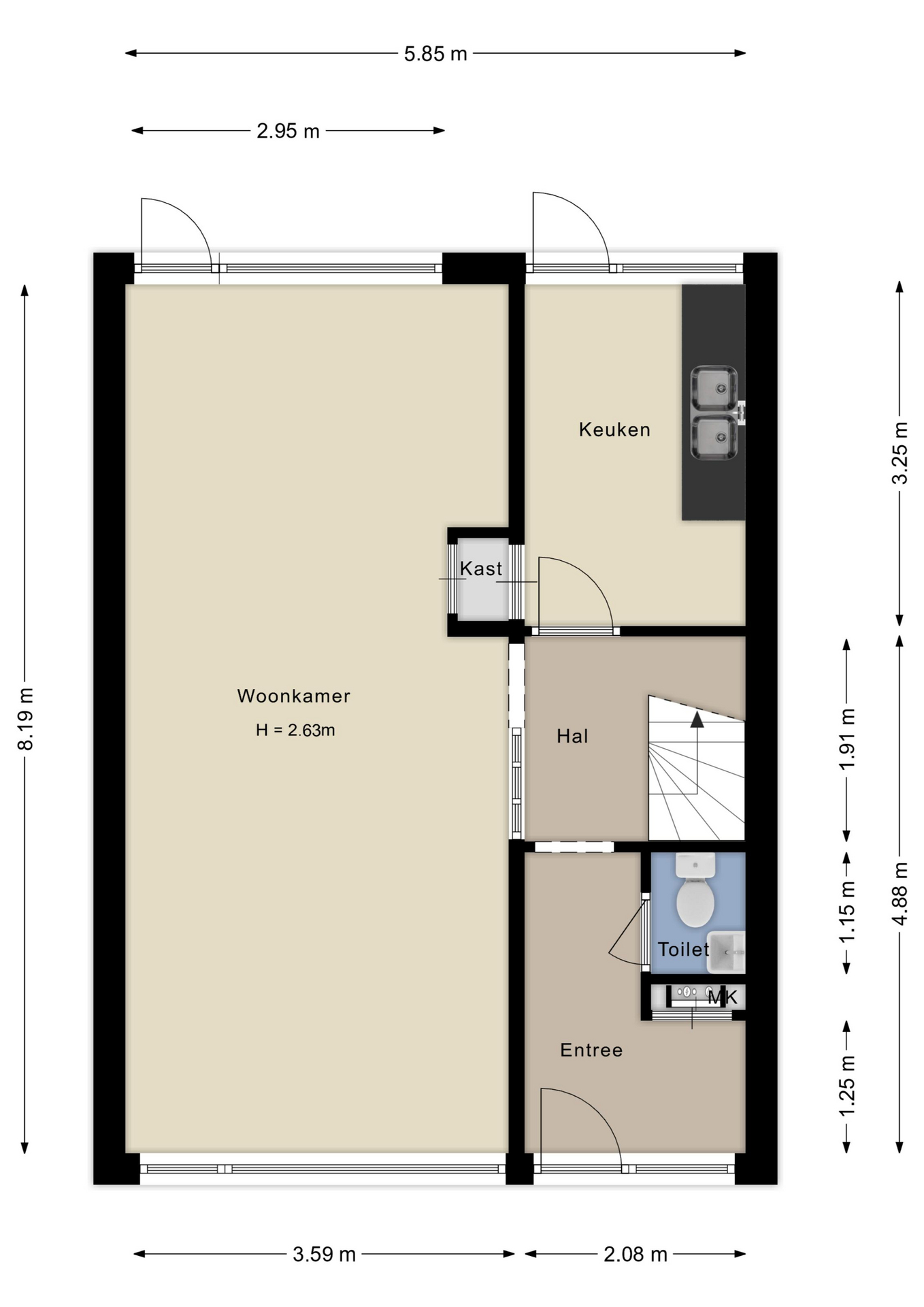 Via de voortuin bereik je de entree met hal, meterkast, toilet en hal. Vanuit de hal heb je toegang tot de woonkamer, keuken en trap. De lichte doorzonwoonkamer heeft grote raampartijen aan zowel de voor- als achterzijde van de woning, waardoor je van veel natuurlijk licht geniet. Vanuit de woonkamer heb je toegang tot de achtertuin, gelegen op het westen. De tuin is ideaal voor de mensen die genieten van de zon en achterin de tuin bereik je de grote berging. Perfect voor het stallen van fietsen of het opslaan van tuingereedschap. De gesloten keuken is geheel naar eigen smaak in te richten en kan ook bij de woonkamer worden betrokken.