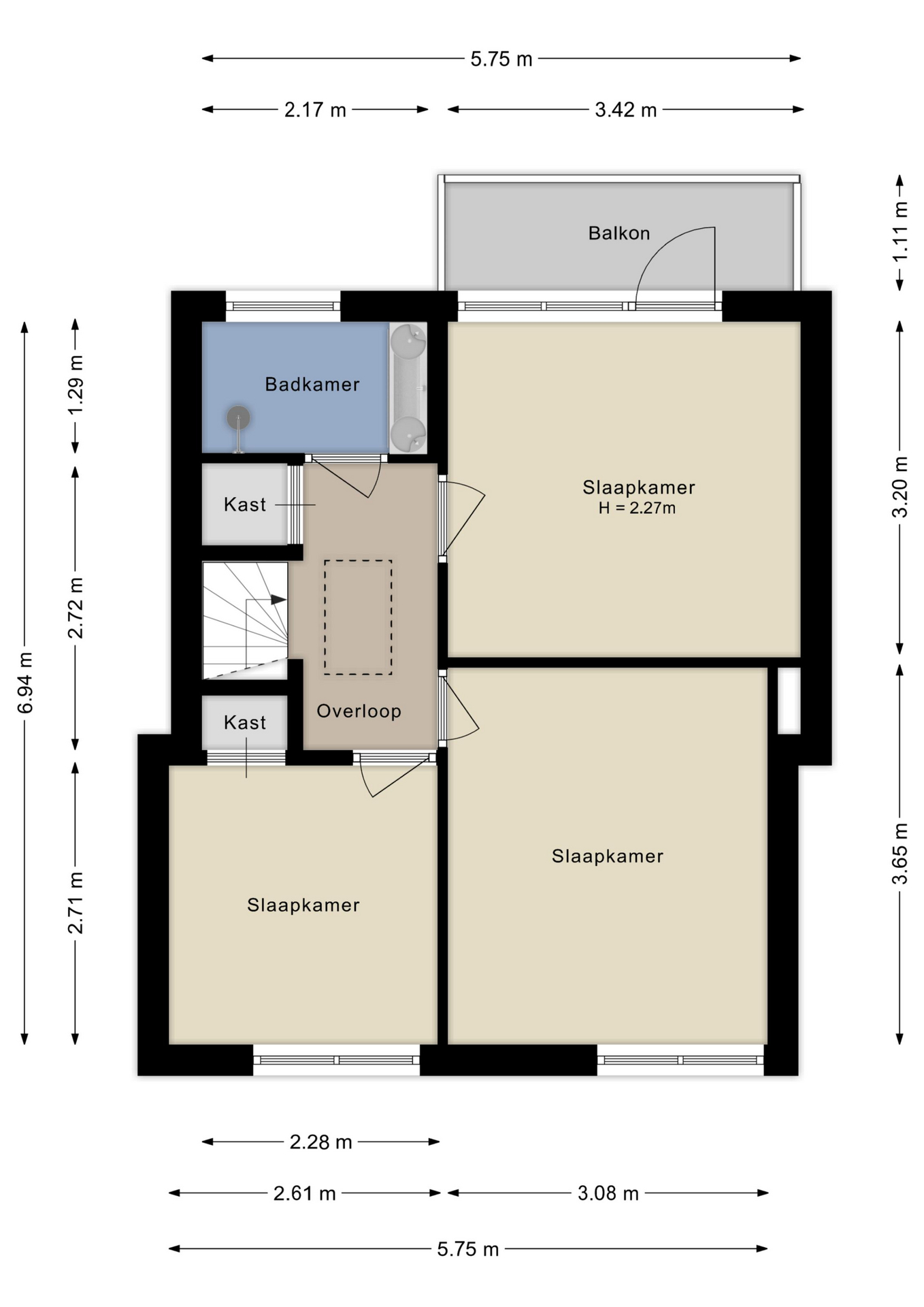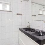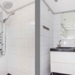 Overloop met handige inbouwkast. Drie slaapkamers: twee aan de voorzijde (waarvan één met vaste kast) en één aan de achterzijde met toegang tot een balkon. De badkamer is uitgerust met een douche, dubbele wastafel met meubel en een raam dat geopend kan worden voor natuurlijke ventilatie.