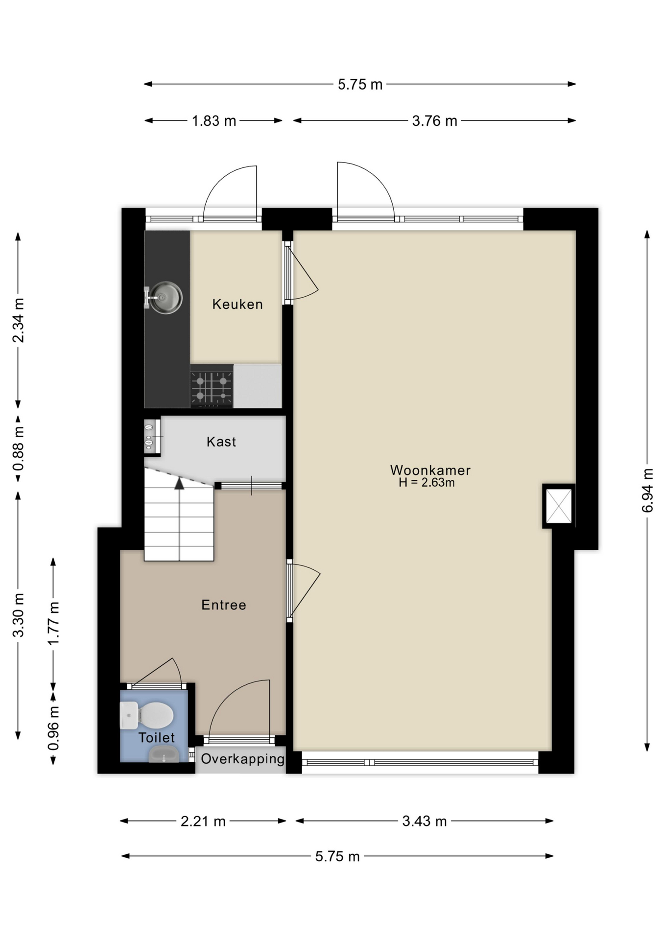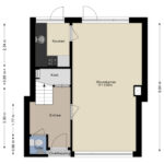 Entree met hal, toilet met fontein en toegang tot een vergrote trapkast met meterkast en aansluiting voor de wasmachine. Vanuit de hal bereik je de trap naar de eerste verdieping. De doorzonwoonkamer biedt veel lichtinval en ruimte voor zowel een zit- als eetgedeelte, met directe toegang tot de tuin. Aansluitend vind je de halfopen keuken, voorzien van 4-pits gaskookplaat, oven, koel-vriescombinatie, afzuigkap en boiler voor warm water. Ook vanuit de keuken loop je zo de achtertuin in.