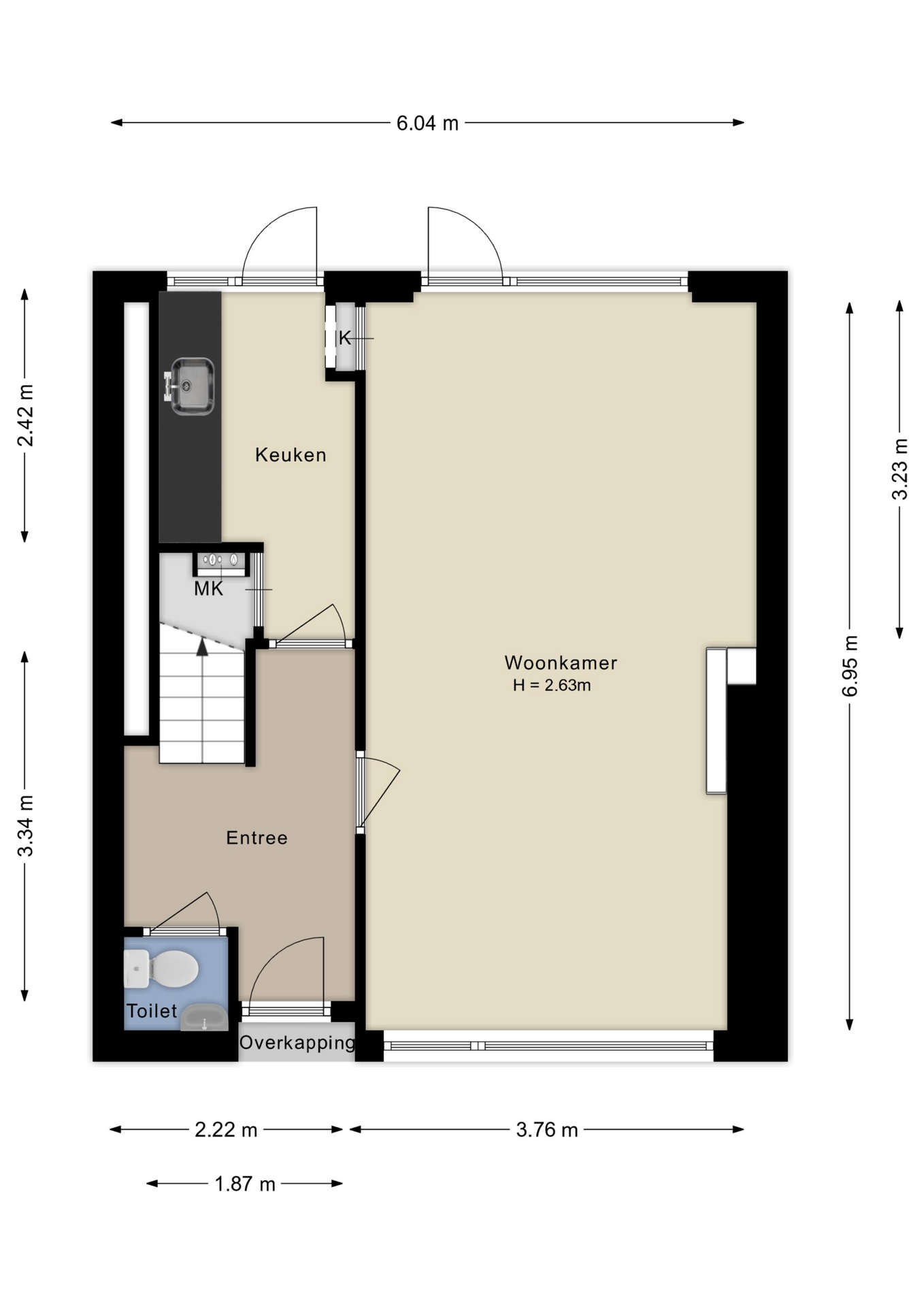 Binnenkomst in de hal met toilet (fontein en granitovloer) en trapopgang naar de verdieping. De lichte doorzonwoonkamer biedt ruimte voor een zit- en eethoek en heeft een directe verbinding met de tuin. De dichte keuken beschikt momenteel over een eenvoudig keukenblok en afzuigkap, met toegang tot de trappenkast (inclusief meterkast) en de achtertuin.