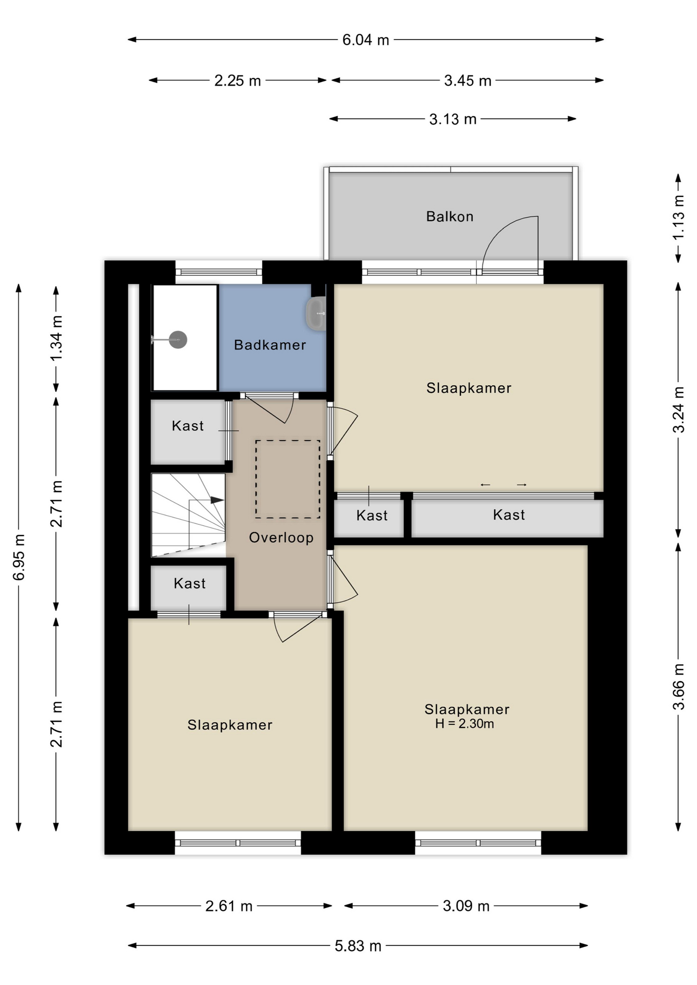 Overloop met vaste kast en aansluiting voor de wasmachine. Drie slaapkamers, waarvan twee aan de voorzijde (één met vaste kast) en één aan de achterzijde met balkon en vaste kast. De badkamer is voorzien van een douche, wastafel en raam voor daglicht en ventilatie.