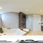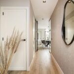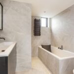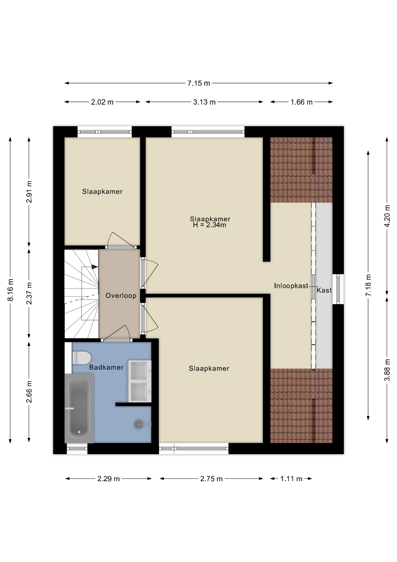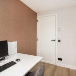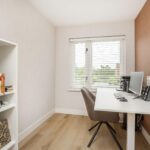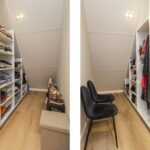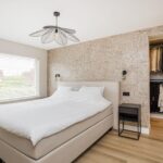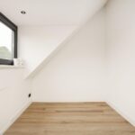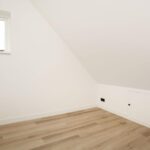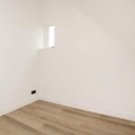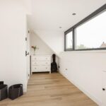 Overloop met toegang tot drie slaapkamers, allen voorzien van hoge plinten en een PVC-vloer. Slaapkamer 1 is zeer royaal en beschikt over een grote walk-in closet. Een ideale hoofdslaapkamer met volop ruimte voor een kingsize bed en extra meubilair. Slaapkamer 2 is een gezellige kamer aan de achterzijde, perfect als kinderkamer of werkplek. De derde slaapkamer, gelegen aan de voorzijde, is licht en ruim en biedt ruimte voor een bed, bureau en kastruimte. De moderne badkamer is vergroot en volledig betegeld in een lichtgrijze tint. Hier vind je een ligbad, ruime inloopdouche, tweede toilet en een wastafelmeubel.
