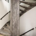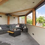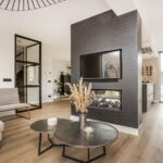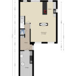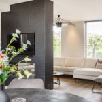 - Uitgebouwde woonkamer met stalen deur en trapkast.