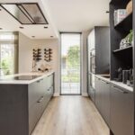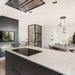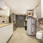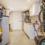 Vanuit de hal is de inpandige garage direct toegankelijk. Deze royale ruimte is voorzien van openslaande deuren naar buiten, wat zorgt voor een praktische in- en uitrijmogelijkheid. De garage is uitgerust met comfortabele vloerverwarming, waardoor de ruimte veelzijdig inzetbaar is, bijvoorbeeld als hobbyruimte of werkplaats. Er bevindt zich in de garage, een pantry met een ingebouwde wastafel en afzuigkap – ideaal voor kleine klusjes of extra keukenvoorziening. Tevens is hier de technische installatie ondergebracht, waaronder een energiezuinige warmtepomp, een WTW-unit (warmteterugwinning) en een boiler die bijdraagt aan het duurzame karakter van de woning.