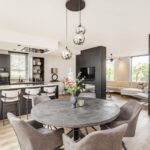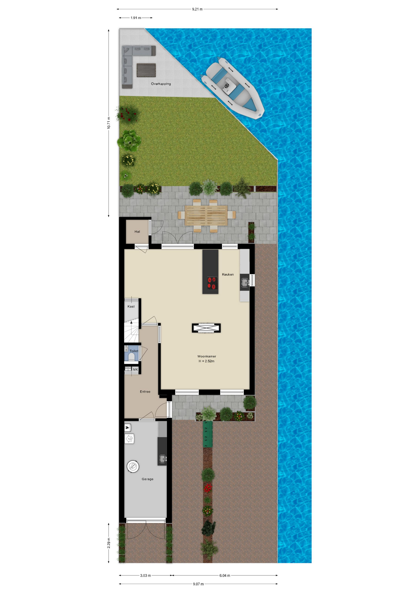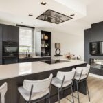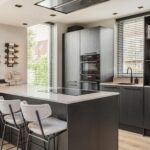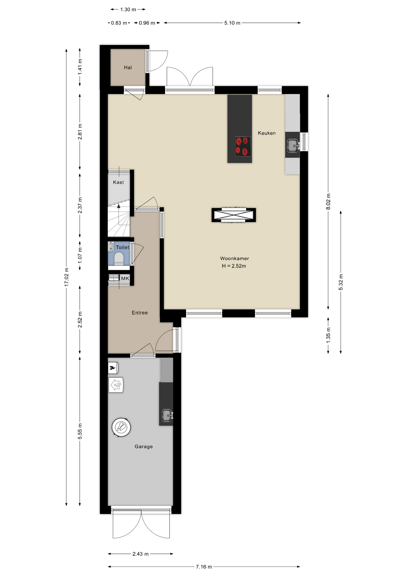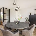 Binnenkomst in een ruime hal met meterkast, garderoberuimte en modern toilet met fontein. De open keuken is luxe uitgevoerd met inductiekookplaat, afzuigkap, combi-oven, elektrische oven, koelkast, vriezer, Quooker en vaatwasser. De gezellige eetkamer met openslaande deuren naar de tuin is de perfecte plek voor lange diners of een kop koffie in de ochtendzon. Aangrenzend ligt de woonkamer, sfeervol ingericht en voorzien van een moderne sierhaard (waterdamp) die zorgt voor extra ambiance. Onder de trap bevindt zich een praktische trapkast. De gehele begane grond is voorzien van een kwalitatieve PVC-vloer met vloerverwarming én -koeling. Aangrenzend vind je de praktische bijkeuken, met extra bergruimte én een tweede toegang tot de achtertuin.