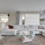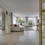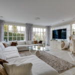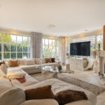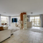 We lopen door naar de living: een bijzonder royale, lichte leefruimte met grote raampartijen rondom. De nette vloer en strakke wandafwerking zorgen voor een moderne uitstraling.