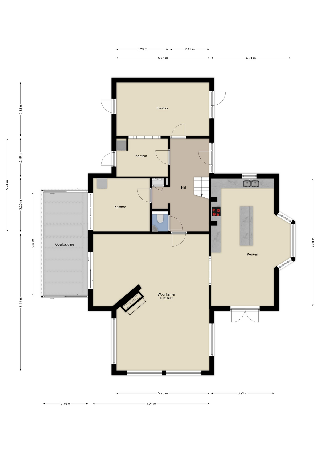 Via de ruime oprit en het sfeervolle hekwerk bereik je de entree. In de hal valt direct de keurige afwerking op: moderne vloeren, strakke wanden en een prettige lichtinval. Vanuit hier heb je toegang tot het kantoor aan de voorzijde en de extra ruimte die momenteel als kapsalon in gebruik is. Deze ruimte heeft een eigen entree en kan dan ook perfect dienen als praktijk aan huis, hobbyruimte, speelkamer of eventueel een slaapkamer op de begane grond.