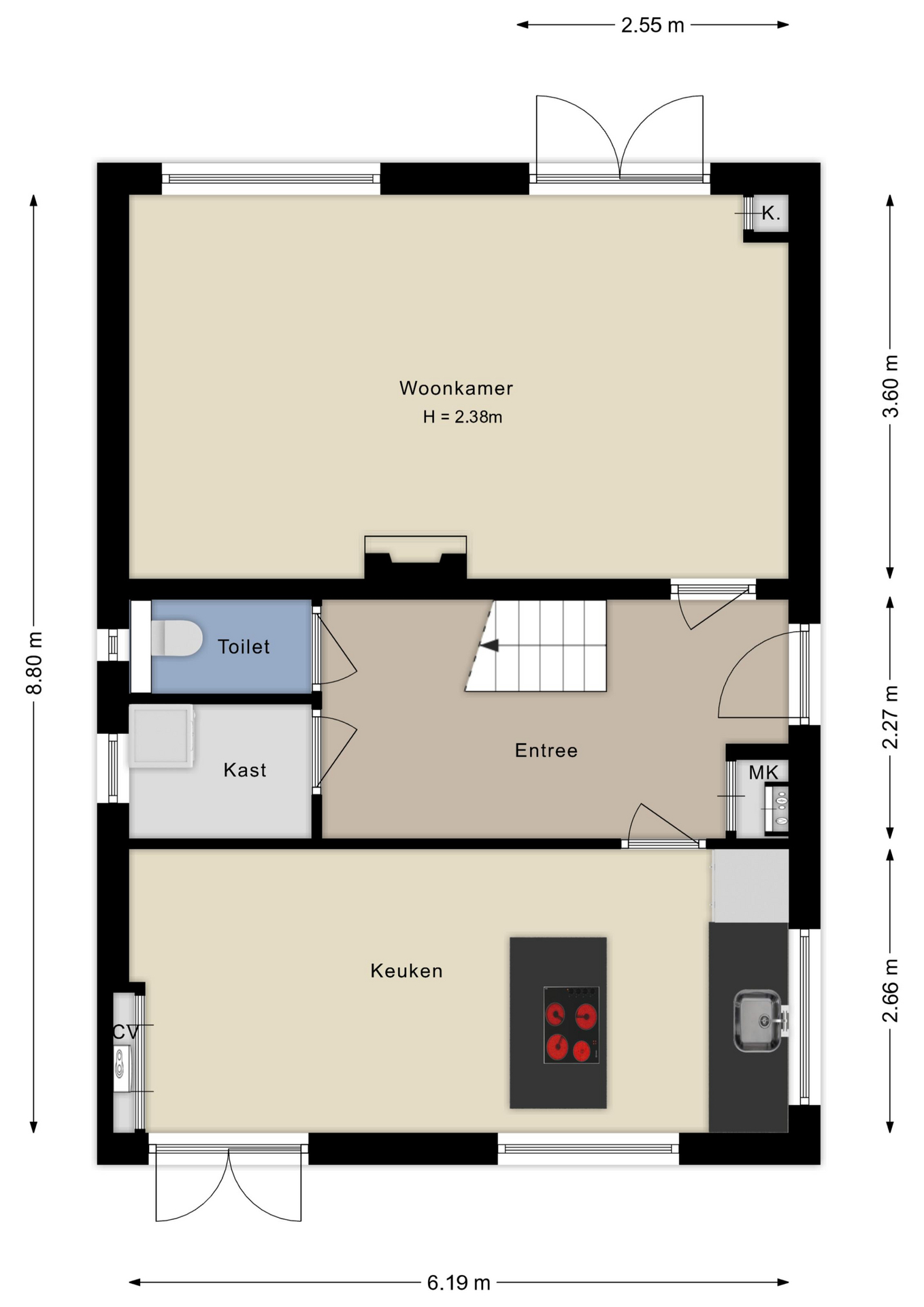 Bij binnenkomst valt meteen de heldere hal op, die overgaat in de ruime woonkamer met een sfeervolle houtkachel en een praktische tegelvloer. De woonkamer biedt met zijn 22 vierkante meter voldoende ruimte om gasten te ontvangen of samen te zijn. Aan de andere zijde van de hal bevindt zich een moderne gesloten keuken, uitgerust met een functioneel kookeiland en voldoende plek voor een grote eettafel. Het uitzicht op de tuin maakt koken hier dagelijks een genot. Op de begane grond vind je verder een toilet en handige bergruimte.
