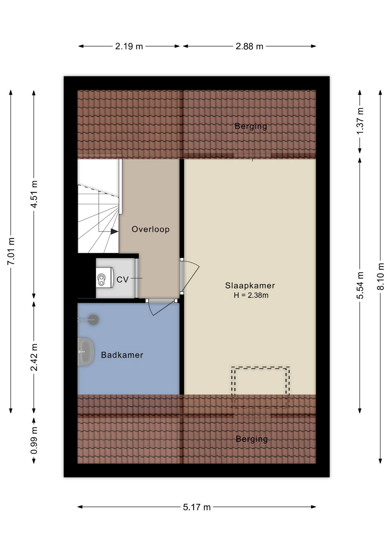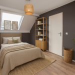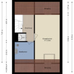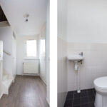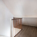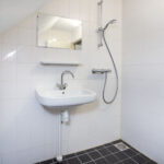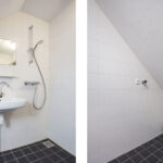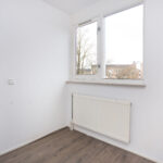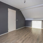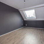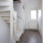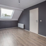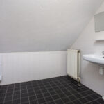 De vaste trap leidt naar de bovenste woonlaag. De ruime overloop biedt toegang tot de tweede, royale slaapkamer. Deze is voorzien van een dakraam en bergruimte achter de knieschotten. Via de overloop kom je ook bij de stookruimte met de cv-installatie en mechanische ventilatie, evenals de badkamer met wastafel, douche en aansluiting voor de wasmachine.
