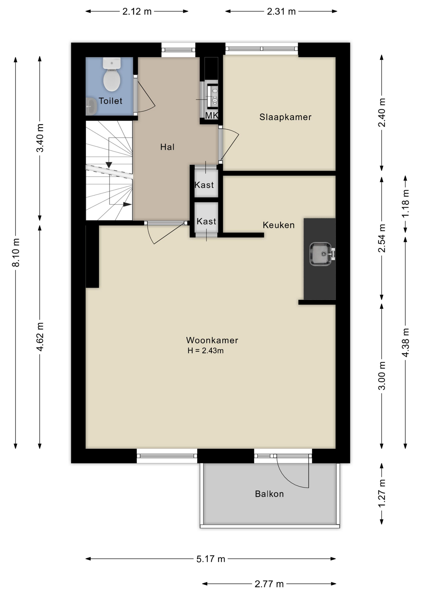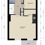 Je komt binnen in de hal met toegang tot de meterkast, het toilet met fontein en de woonkamer. De woonkamer is heerlijk licht en beschikt over een vaste kast. Vanuit hier stap je zo het ruime, op het zuiden gelegen balkon op, een plek waar je de hele dag van de zon kunt genieten. De keuken heeft een eenvoudige driebloksopstelling met tegenovergelegen nis voor extra apparatuur. Vanuit de hal bereik je verder nog een slaapkamer, een vaste kast en de trap naar de bovenste verdieping.