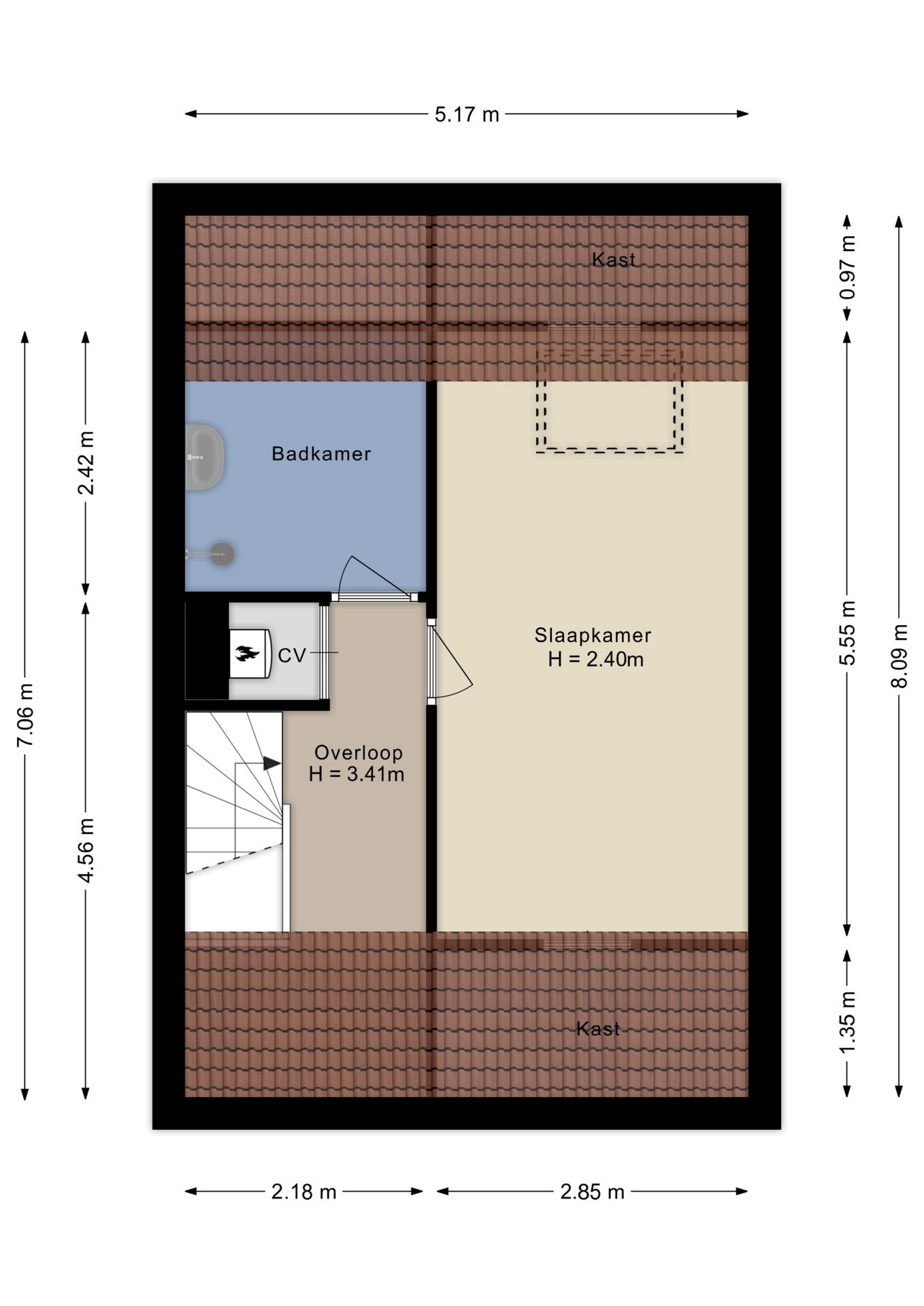 Via de vaste trap bereik je de slaapverdieping. Vanaf de ruime voorzolder is er toegang tot een bergkast, de slaapkamer en badkamer. In de bergkast zijn de cv-opstelling en aansluitingen voor de wasmachine gesitueerd. De ruime slaapkamer beschikt over een groot dakraam aan de achterzijde. De badkamer is voorzien van een douche, wastafel en aansluiting voor de wasmachine.
