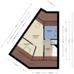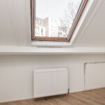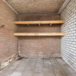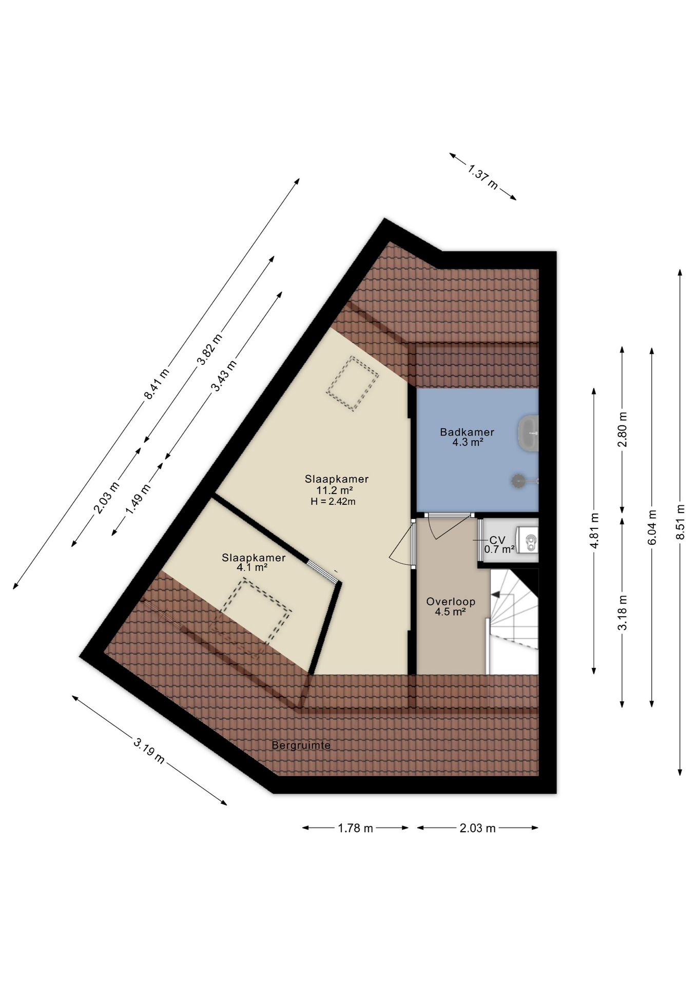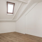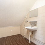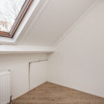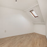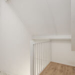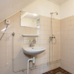 De trap in de hal leidt naar de overloop. Deze ruime overloop beschikt over een vaste kast met daarin de opstelplaats voor de mechanische ventilatie en de cv-installatie. De grotendeels betegelde badkamer is voorzien van een wastafel, douche en een aansluiting voor de wasmachine. Tevens is de slaapkamer bereikbaar, uitgerust met een dakraam. De kamer is momenteel opgedeeld met een schuifdeur en bestond oorspronkelijk uit één grote ruimte. Ook hier is een dakraam aanwezig. Achter het knieschot is extra bergruimte beschikbaar.