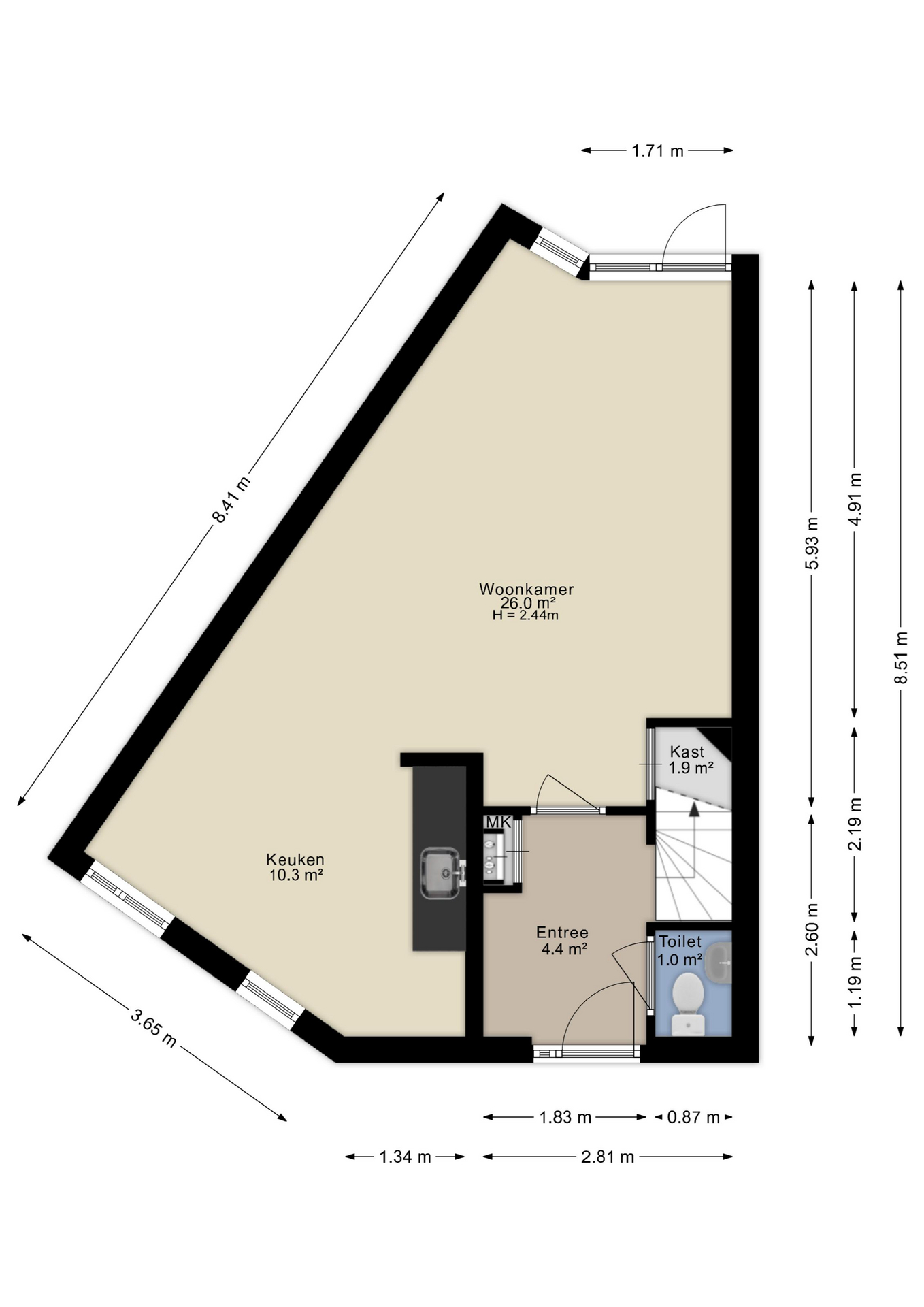 Via de entree kom je in de hal, die toegang geeft tot de verschillende ruimtes. In de hal bevinden zich de meterkast, een staand toilet met fonteintje en de doorgang naar de woonkamer. De woonkamer is licht en beschikt over een trapkast. Vanuit hier bereik je de halfopen keuken aan de voorzijde, uitgevoerd met een eenvoudig keukenblok. Daarnaast biedt de woonkamer toegang tot de achtertuin.