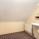 De vaste trap leidt naar de bovenste woonlaag. De ruime overloop geeft toegang tot de royale slaapkamer, voorzien van een dakraam en extra bergruimte achter de knieschotten. Tevens bereik je vanaf hier de badkamer, uitgerust met een wastafel, douche en aansluiting voor de wasmachine.