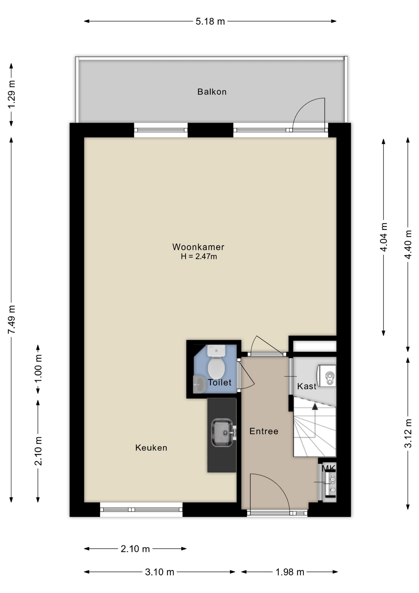 Via de entree kom je in een ruime en lichte hal met toegang tot de toiletruimte met fontein, de meterkast, een praktische trapkast met opstelplaats voor de cv-ketel en de trap naar de bovenverdieping. Vanuit de hal bereik je de royale woonkamer met directe toegang tot het balkon. Het balkon is gunstig gelegen op het zuiden, waardoor je hier al vroeg op de dag van de zon kunt genieten. Aan de voorzijde van de woning bevindt zich de halfopen keuken, momenteel voorzien van een eenvoudig keukenblok.