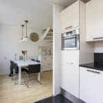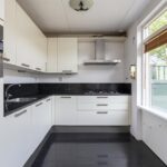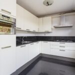 Moderne en ruime keuken met veel ruimte en een eethoek. Er zijn diverse vaste kasten en inbouwapparatuur zoals een koelkast, vaatwasser, oven, 5-pits gaskookplaat, afzuigkap en veel werk- en opslagruimte. De keuken heeft een mooie, donkere tegelvloer die voor een luxe uitstraling zorgt. Via de keuken heb je toegang tot de tuin via een openslaande deur.