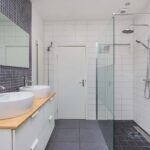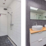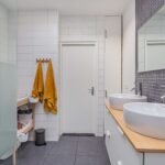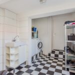 De keuken (2010) beschikt over een PVC vloer, een lichtkoepel (te openen), L-vormig aanrecht met lichte kastjes en alle denkbare gemakken qua apparatuur, o.a.s een 90 cm. breed gasfornuis. De tussenhal met vaste trap geeft toegang tot een vernieuwde toiletruimte en een ruime badkamer voorzien van inloopdouche, dubbele wastafel met spiegel, lichtkoepel (te openen), aansluiting wasmachine in de bijkeuken geplaatst. De CV ketel is opgehangen in de bergruimte in de uitbouw.