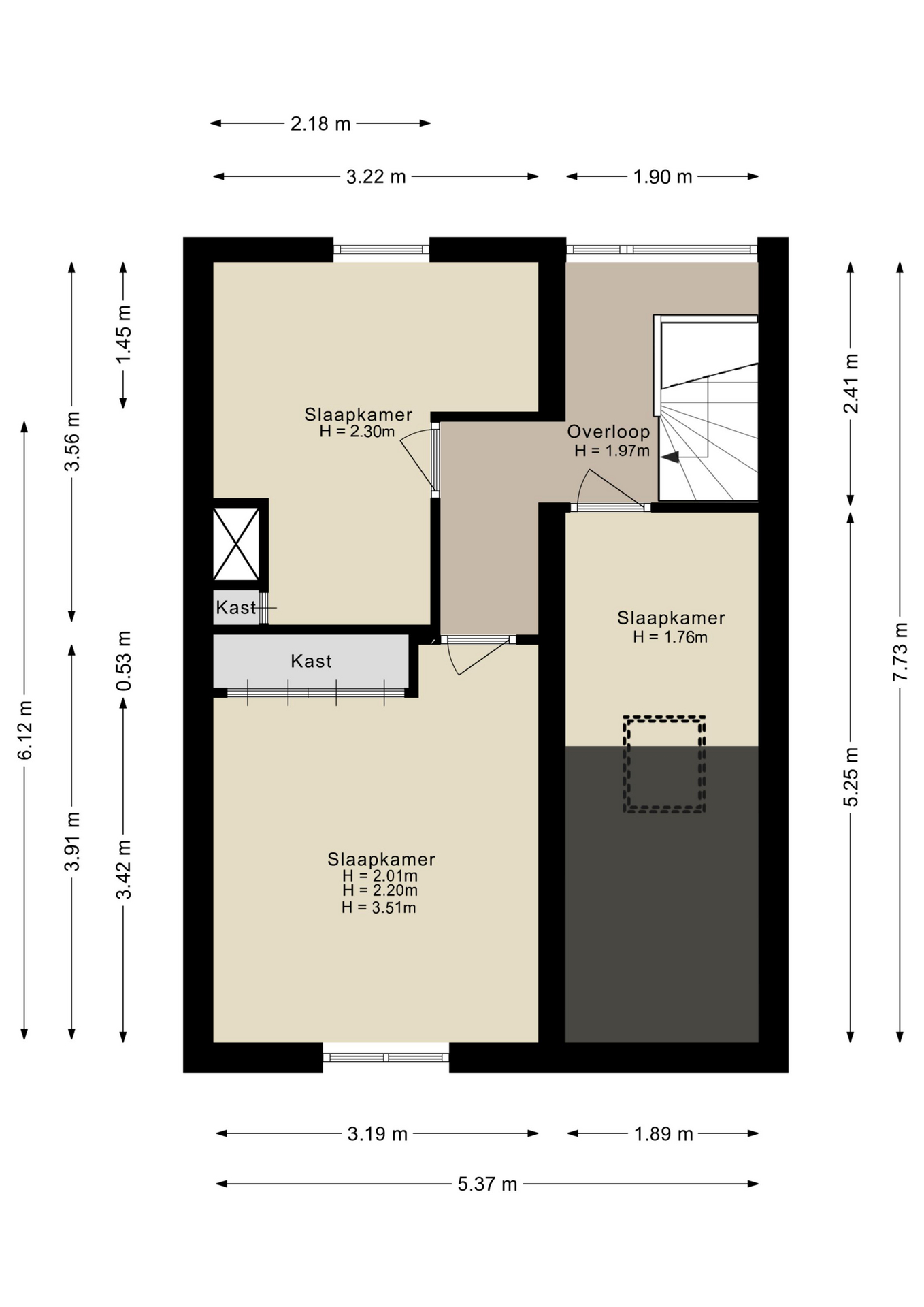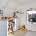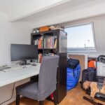 Vaste trap, overloop, 2 slaapkamers, inbouwkasten en 3.60 hoge nok. De tweede met smalle inbouwkast. De derde kamer is momenteel in gebruik als werkkamer voorzien van een Velux dakvenster (vernieuwd in kunststof uitgevoerd). De gehele eerste verdieping is voorzien van isolerende vloerpanelen met een laminaatvloer.